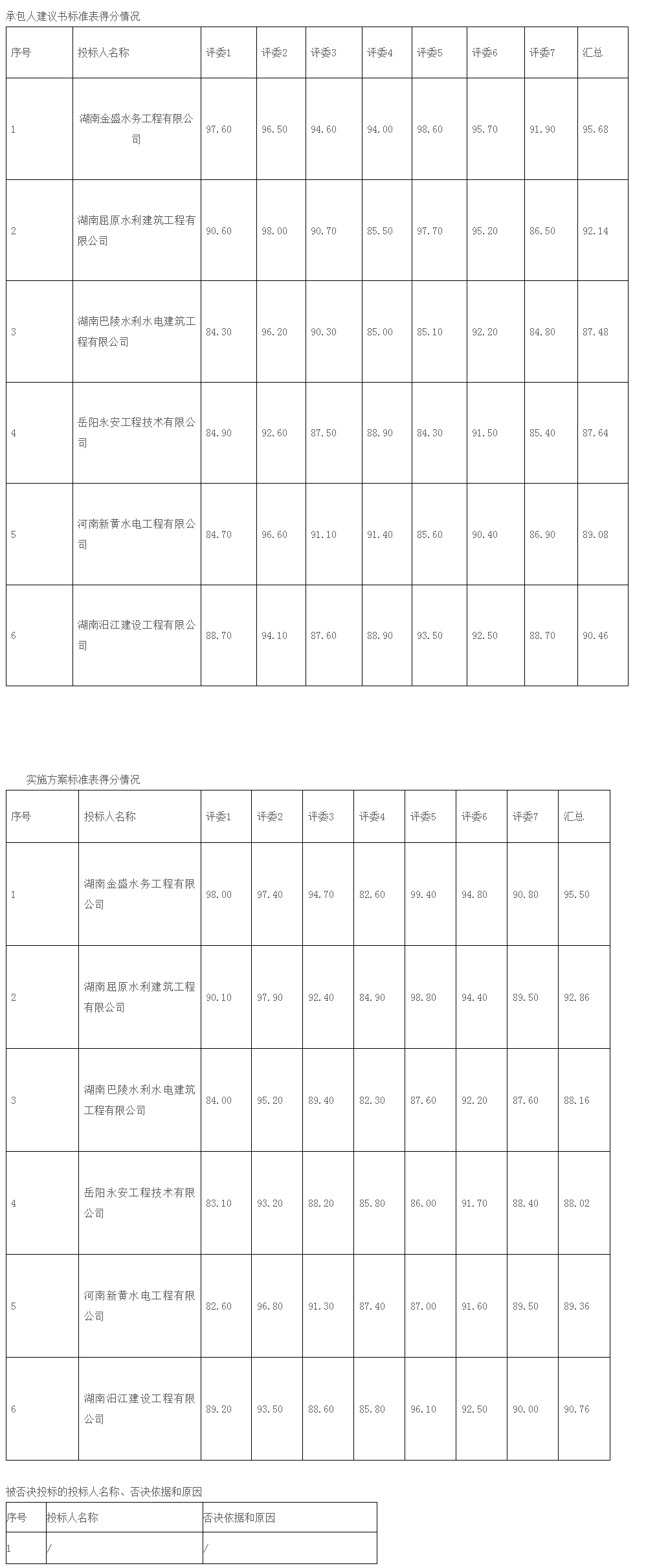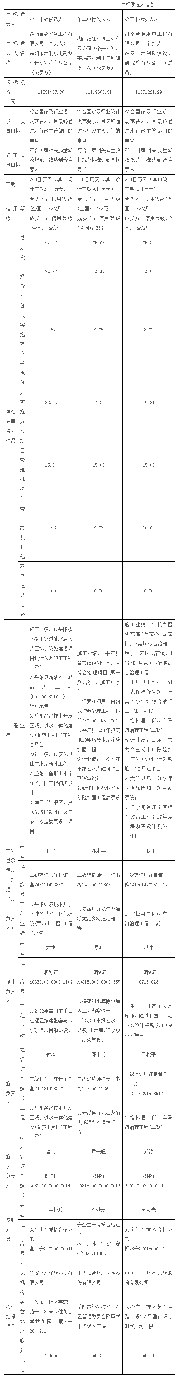 湖南岳建项目管理有限公司受岳阳县水利建设项目服务中心的委托,代理岳阳县毛田河山洪沟防洪治理项目工程总承包招标,2024年03月22日09:30分(北京时间)在岳阳市公共资源交易中心进行了公开开标,在岳阳县水利局水利工程建设管理和监督股、岳阳县招标投标综合管理办公室监督下,依法组建的评标委员会按照招标文件确定的评标原则和评标办法进行了细致的评审,并推荐本项目中标候选人排名如下:
