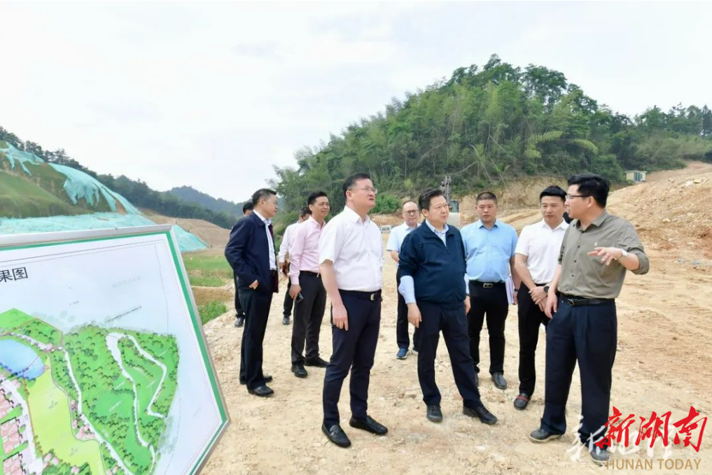 (5月10日,湘潭市委、市政府相关负责人带队督导湘乡市梅桥镇酒铺村环山塘集中联建点涉嫌无证采矿问题整改。 图来自省生态环境厅)