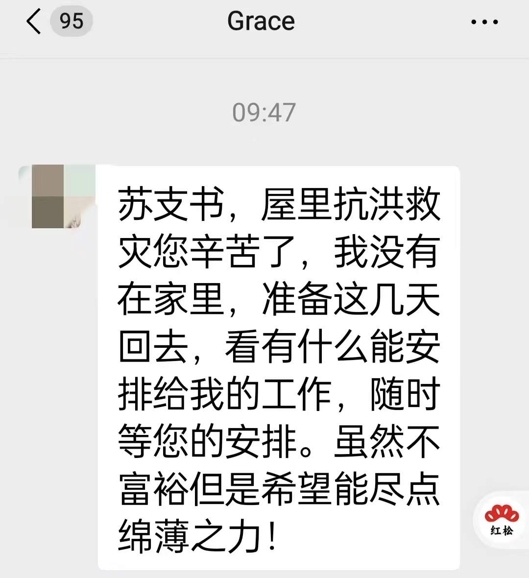 行动是最有力的带动,示范是最鲜明的垂范。高莲是瓦圻村的一名入党积极分子,听说家乡开始防汛后,她主动向村党总支书记请战:“苏支书,家里抗洪救灾您辛苦了,我没有在家里,准备这几天回去,看有什么能安排给我的工作,我随时等您的安排”。