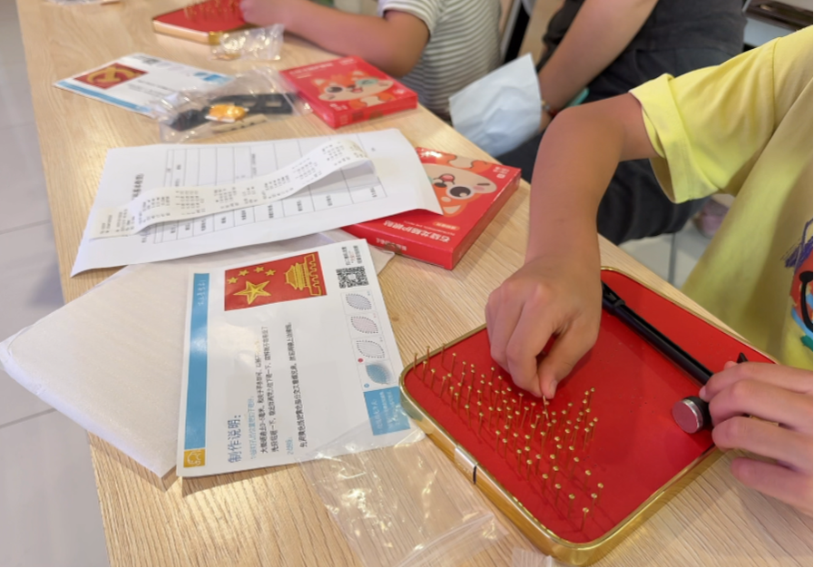 活动当日,现场洋溢着节日的喜庆与孩子们的欢声笑语。在专业老师的指导下,家长与孩子们纷纷化身“工匠”,投入到钉子画的奇妙世界中。一根根小钉在巧手下立起,勾勒出庄严的图案;一圈圈金红线缠绕其间,将炽热的“中国红”与“我爱你中国”的深情告白,牢牢定格在画布之上。这份需要高度专注与精细手眼协调的创作,不仅是对非遗匠心的传承,更是一次难得的亲子协作与情感交流。