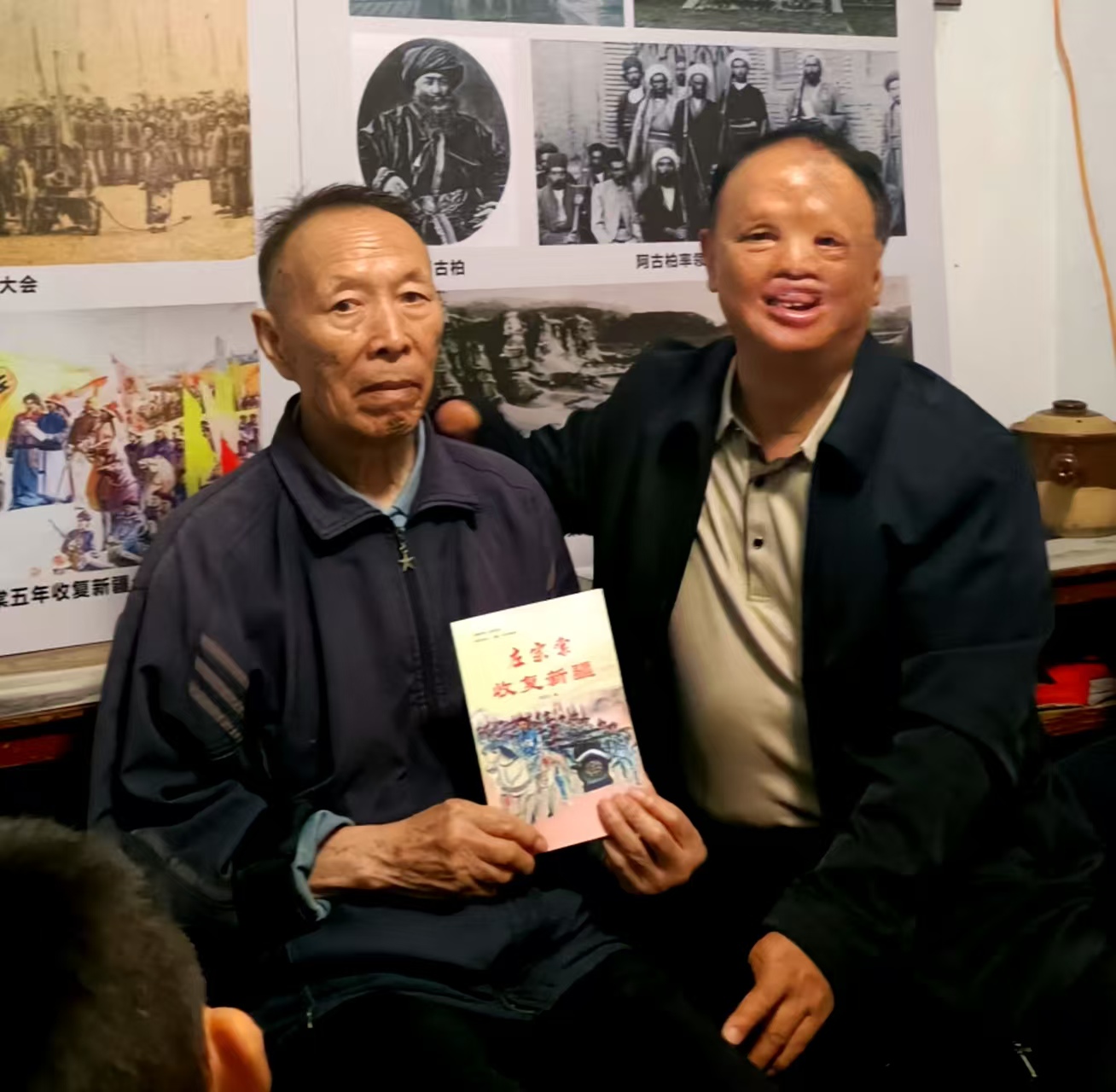(周葛龙向采访者姚平赠送他创作的《左宗棠收复新疆》一书)