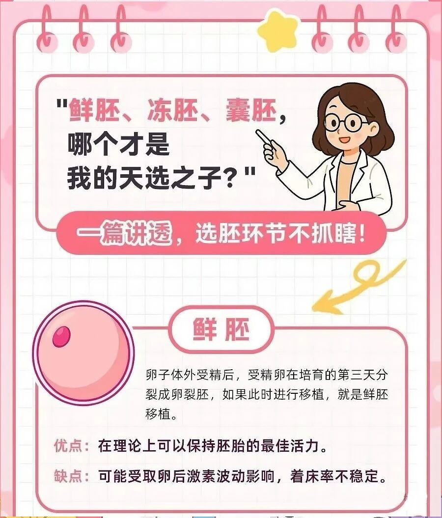 卵子体外受精后,受精卵在培育的第三天分裂成卵裂胚,如果此时进行移植,就是鲜胚移植。