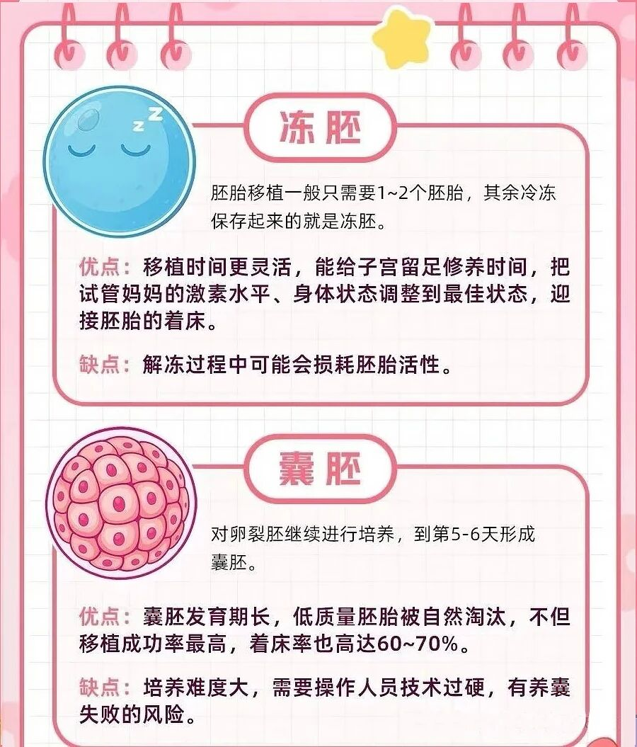 优点:囊胚发育期长,低质量胚胎被自然淘汰,不但移植成功率最高,着床率也高达60~70%。