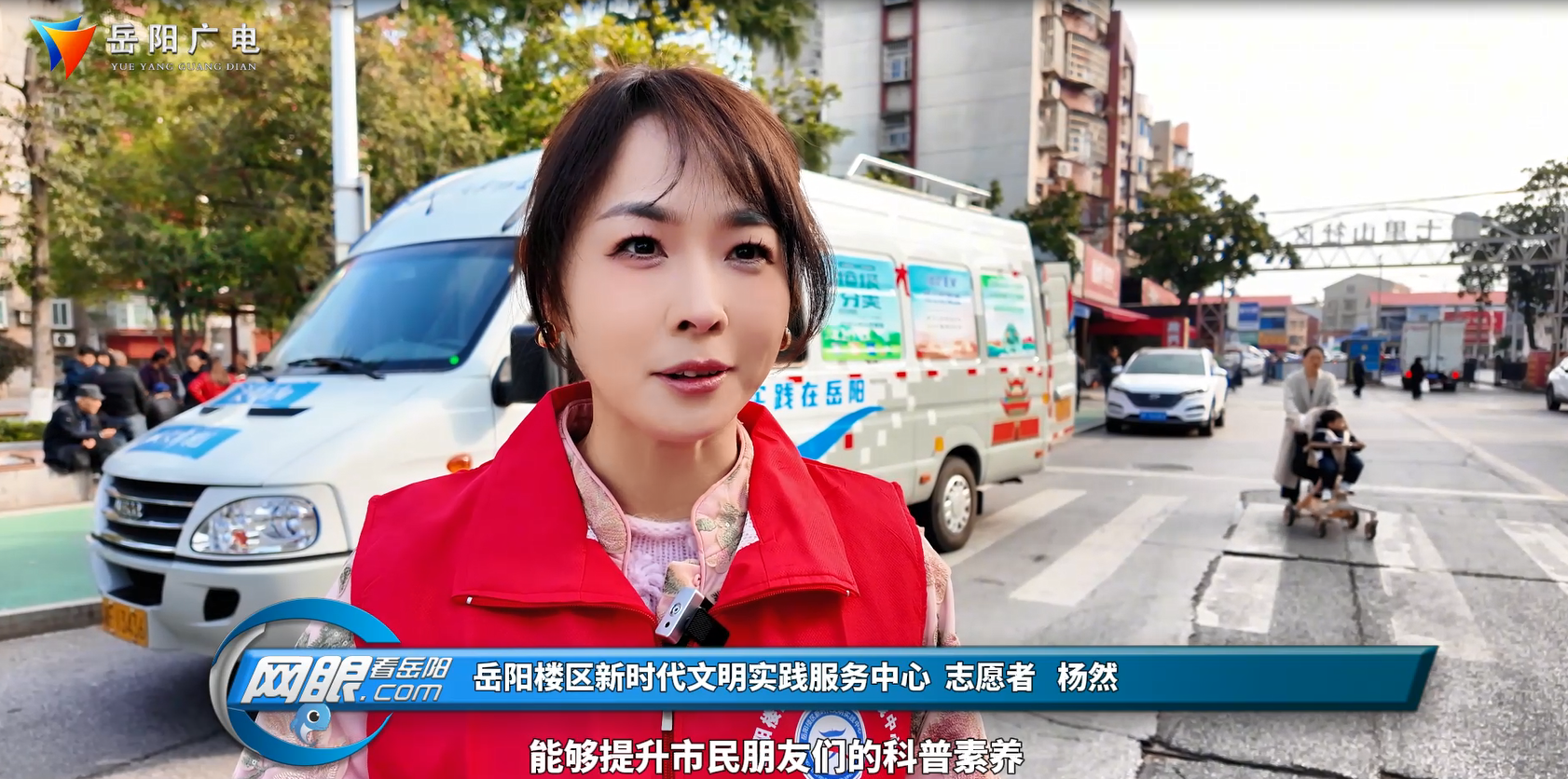 岳阳楼区新时代文明实践服务中心志愿者 杨然:本次活动,我们希望能够提升市民朋友们的科普素养,让我们为我们的城市,注入更多文明环保与温暖的力量。