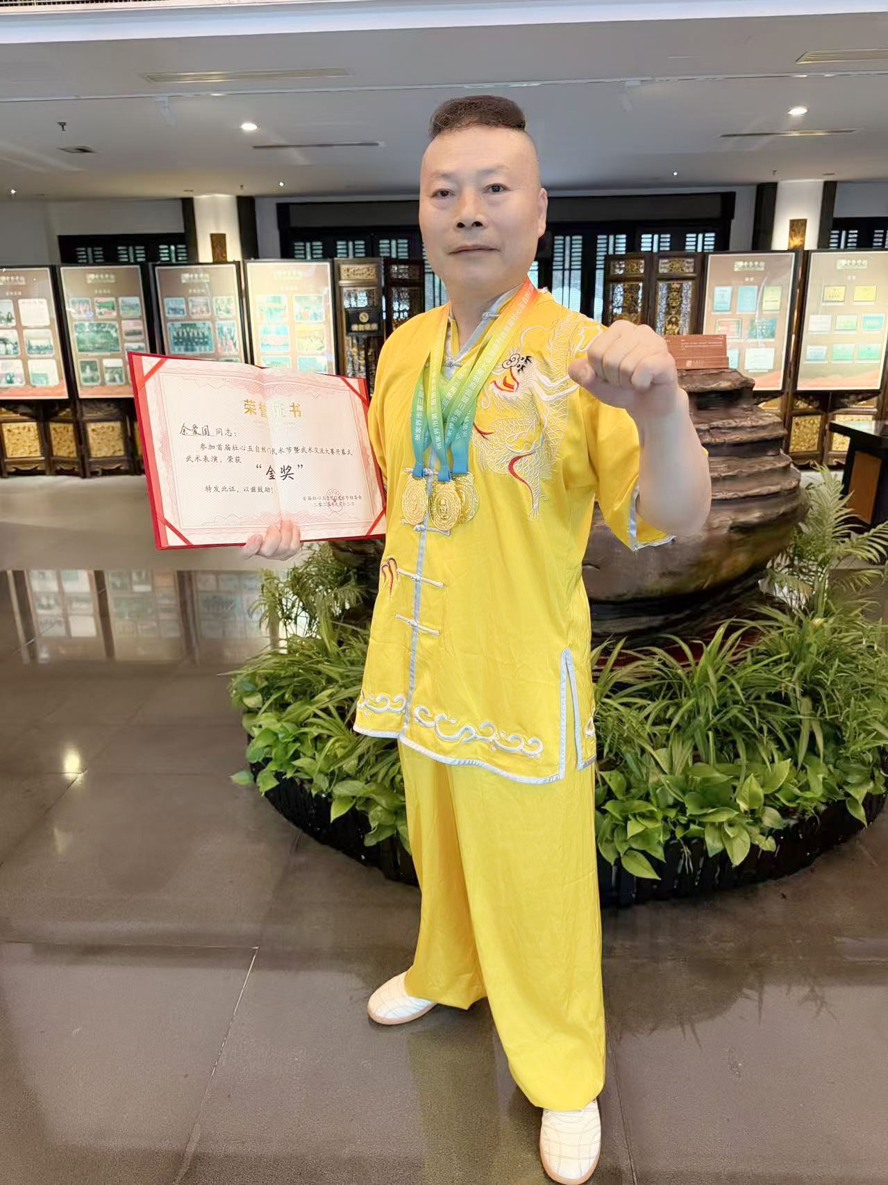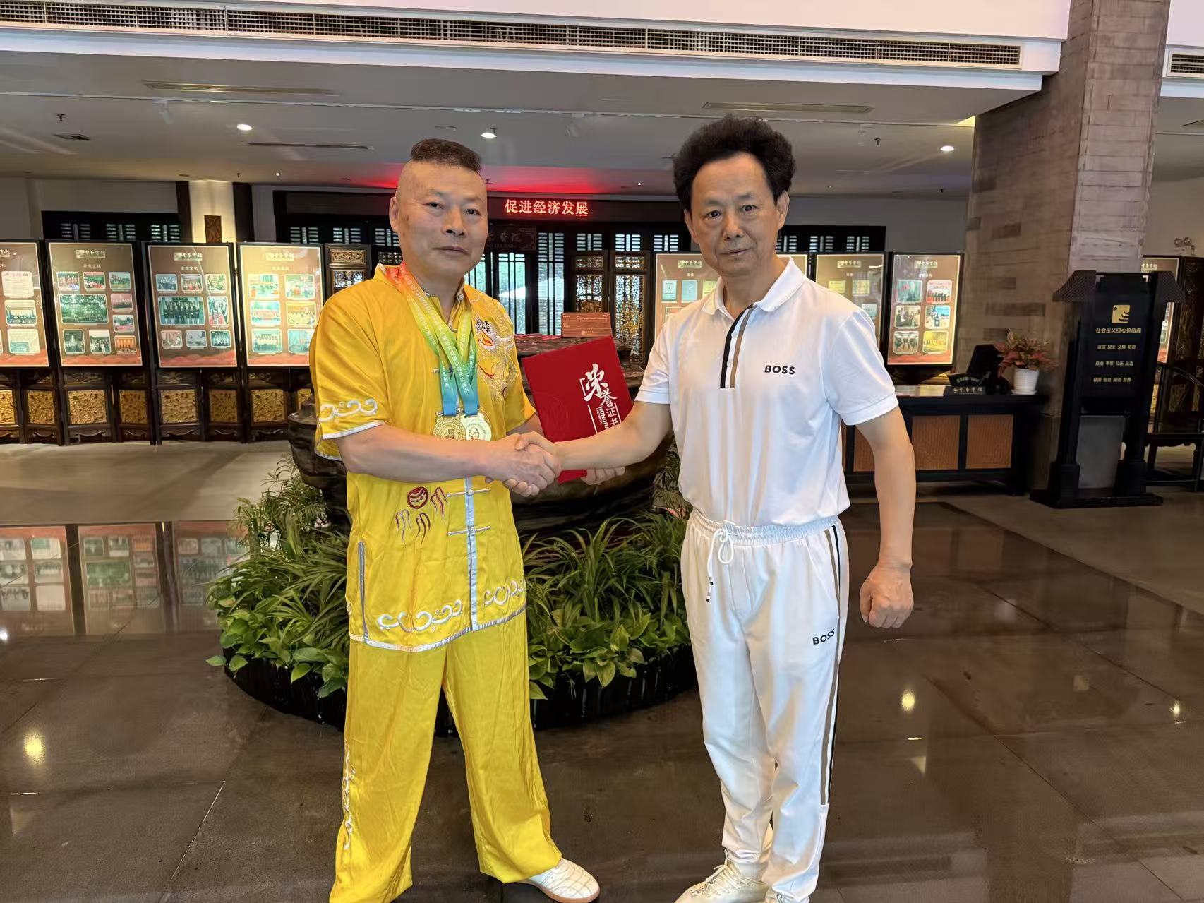 湖南理工学院体育学院副院长、省武协副主席、湖南省龟牛拳研究会执行会长张一龙代表研究会上台领取先进单位奖牌。其本人曾获湖南理工学院“师德十佳”“先进工作者”等荣誉,秉持武德、团结同仁,在武术推广中展现出良好的组织协调与资源整合能力。