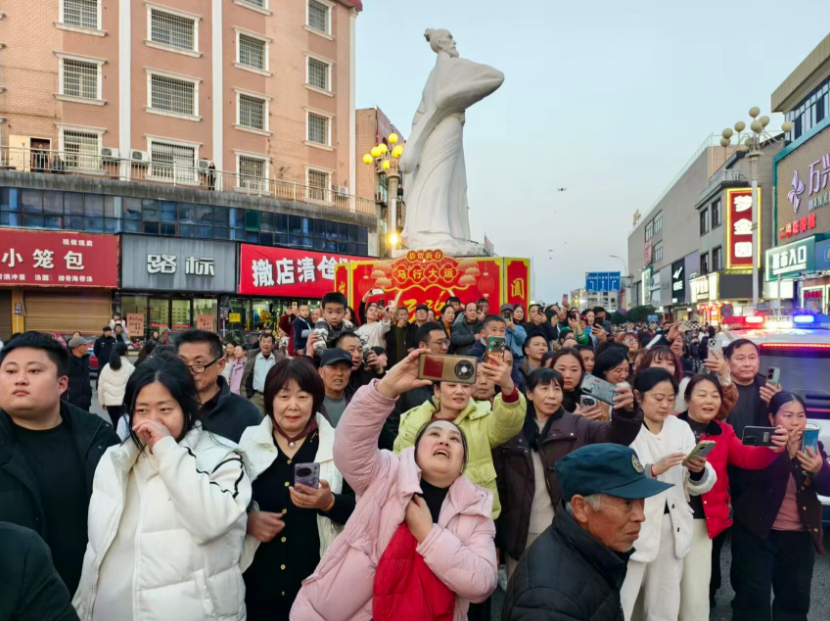 七大特色巡游方阵从区办公楼花园路有序出发,沿屈汨路、屈原中学、橘颂路缓缓前行,最终汇聚于屈子诗园,将屈原文化的精神内核与地域生活的烟火气息紧密串联。少年先锋方阵率先登场,轮滑小将化身“哪吒”,灵动演绎“闹海”奇趣,活力满满;开篇方阵气势恢宏,震天锣鼓响彻云霄,“营田灯会”主题字牌在夜色中熠熠生辉;“一马当先”主题雕塑引领骏马造型队伍前行,旌旗翻飞间,“鲤跃龙门”“龙腾狮舞”等特色表演轮番上演,引得沿途观众阵阵喝彩。传统花灯璀璨夺目,花车流光溢彩,秧歌欢快蹁跹,腰鼓铿锵有力,“台故事”叠景生辉,“地故事”妙趣横生,浓浓年味在灯火流转与欢声笑语中肆意流淌。