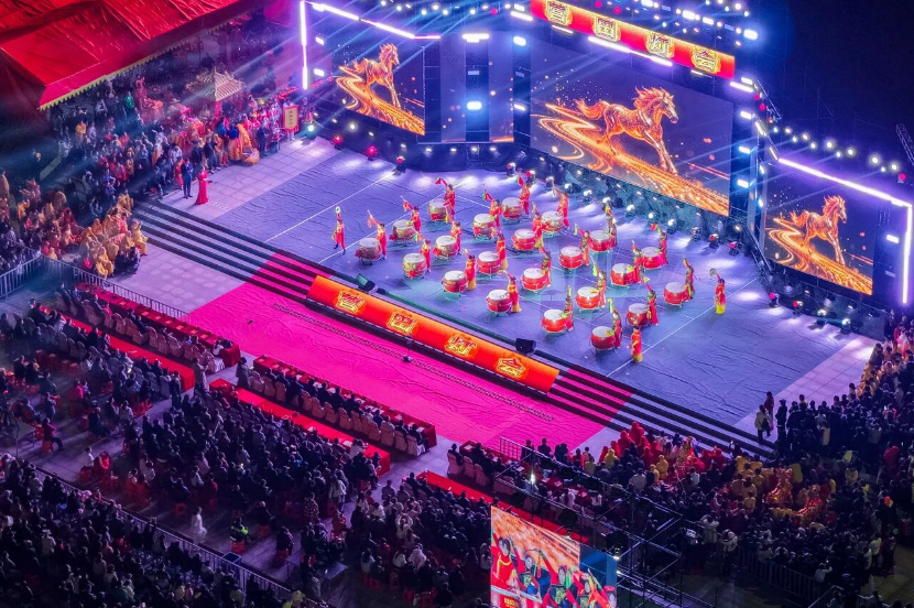 华灯初上,迎春祈福民俗晚会在绚烂灯光秀中拉开帷幕。大鼓队演绎的《金鼓迎春·赛马》擂响新春序曲,激昂的鼓点直击人心,瞬间点燃全场热情。