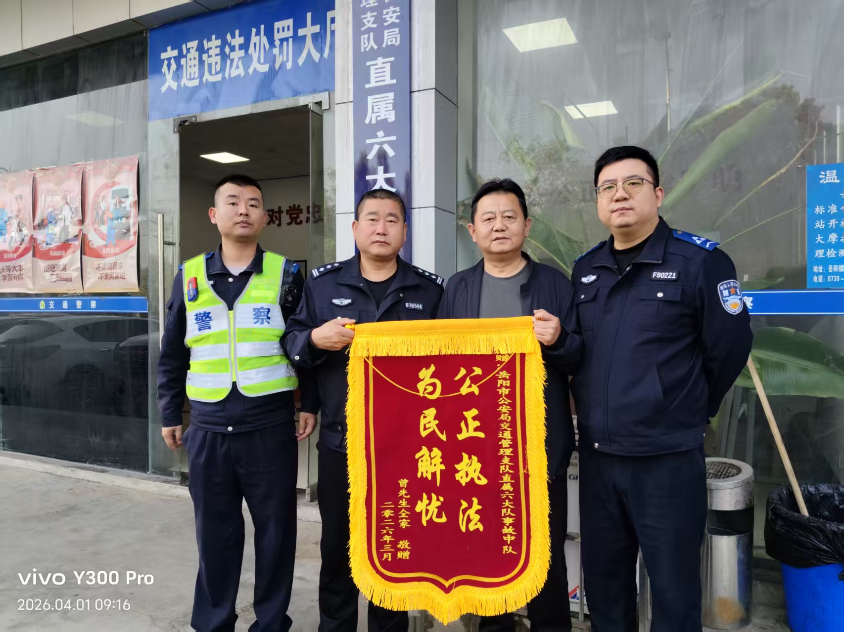 4月1日上午,岳阳市民曾先生专程来到岳阳市公安局交通警察支队直属六大队,将一面印有“公正执法,为民解忧”的锦旗送到民辅警手中,对六大队事故中队民辅警在一起交通事故处理中秉公执法、热情服务表示衷心感谢。